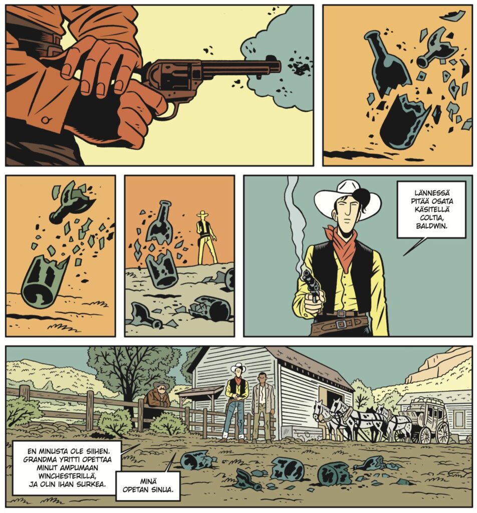 Näiden tarinoiden Lucky Luke liikkuu laajalla skaalalla ja taipuu moneksi – sivustakatsojasta veijarihahmon kautta koston enkeliksi. Appollo ja Brüno osaavat kuitenkin tasapainottaa tarinakatraansa. Turhaa kohellusta tai tunnelmointia ei tarjoilla. Jokainen sivu tietää paikkansa. Albumi kestääkin useita lukukertoja ja paranee lukukertojen myötä. Episodirakenne toimii myös niin kuin on tarkoitettu, eli osasista kasvaa enemmän kuin osiensa summa.