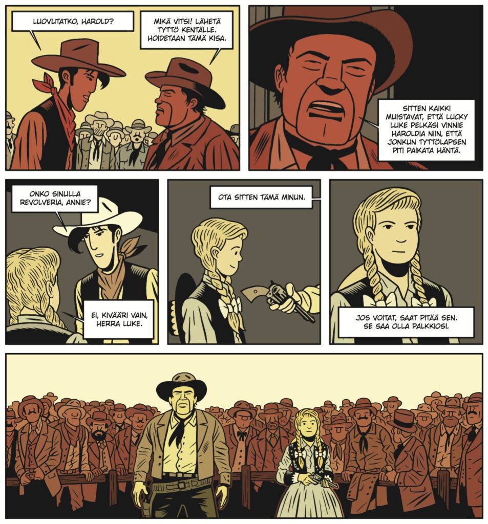 Näissä lyhyissä tarinoissa ei siis seikkaile se kaikille tuttu Lucky Luke. Nyt asetellaan myytin ensimmäisiä osasia paikalleen. Ja se tehdään vakavan westernin keinoin. Mukana ei siis ole lystikkäitä puhuvia eläinhahmoja tai koomisesti koheltavia roistoja. Luke hakee paikkaansa aidosti vaarallisessa ja villissä lännessä, jossa tarvitaan onneakin, jotta seikkailut voisivat jatkua.