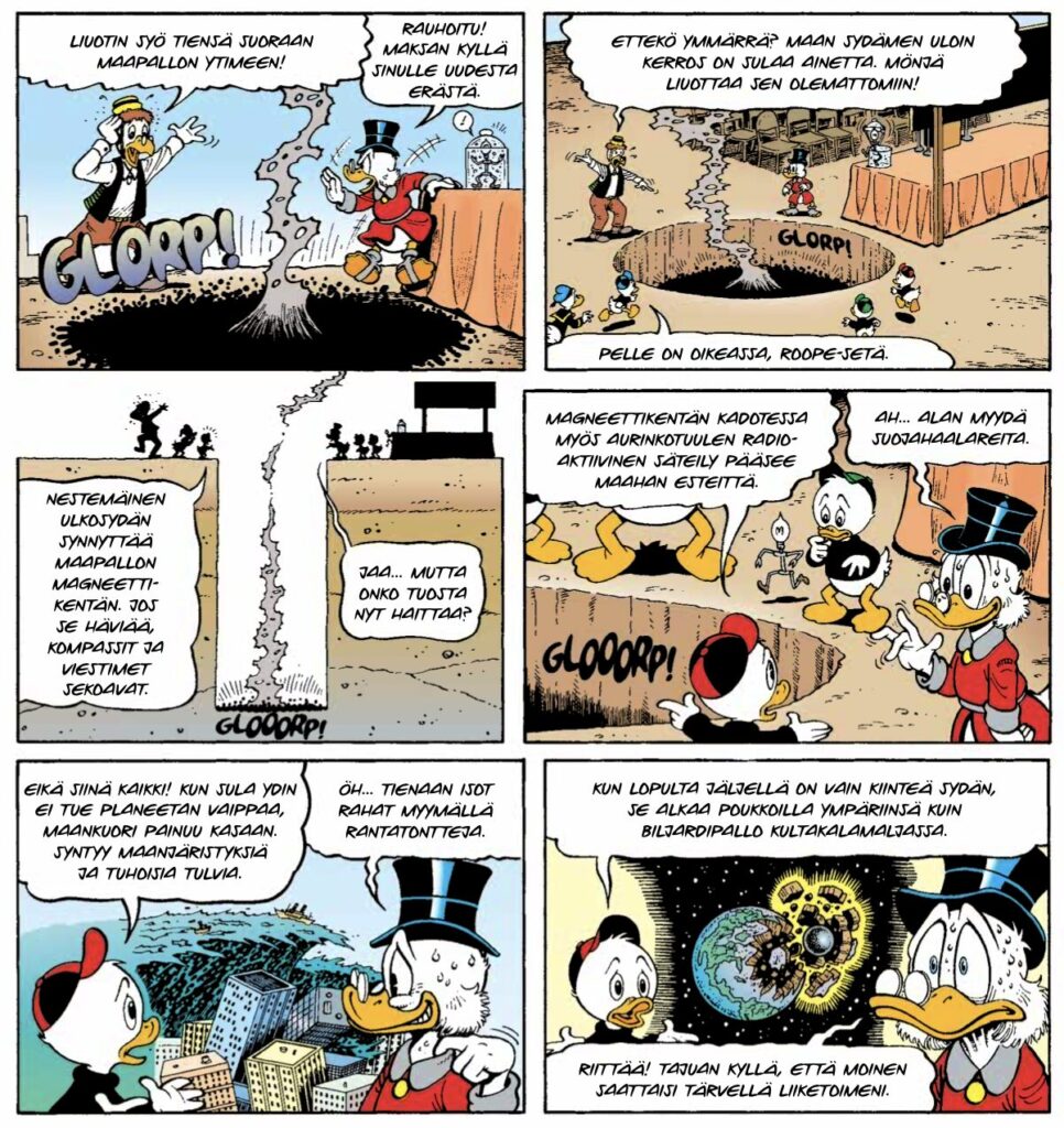 Merkittävimpien Aku-tarinoiden kokoelma ei ansaitsisi paikkaansa kenenkään kirjahyllyssä, jos mukana ei olisi huolella valittua Don Rosan tuunaamaa seikkalua. Tällä kertaa mukana Matka Maan keskipisteeseen (The Universal Solvent, 1995), ja se saattaa olla myös paras mahdollinen valinta. Tämän tarinan puitteissa Rosa pääsee esittelemään kaikkia vahvuuksiaan. Insinöörin logiikalla Pelle Pelottoman pähkähullusta keksinnöstä otetaan kaikki tehot irti. Samalla lukijaa yleissivistetään muun muassa maapallon toimintamekaniikasta. Aku ja kumppanit joutuvat melkoiseen pyöritykseen, ja saattaapa muuten itse sarjakuvakirjakin pyöriä lukijan käsissä tämän seikkailun villeimmissä käänteissä.