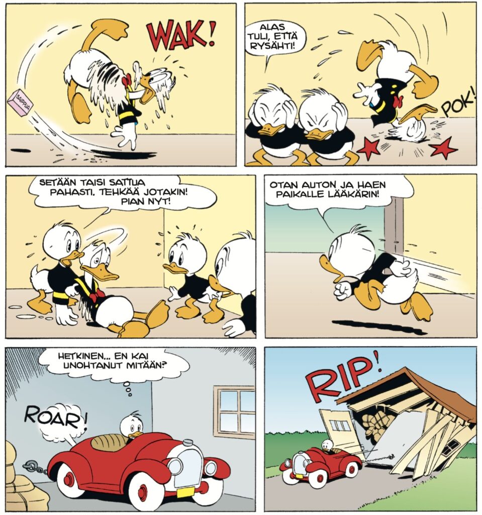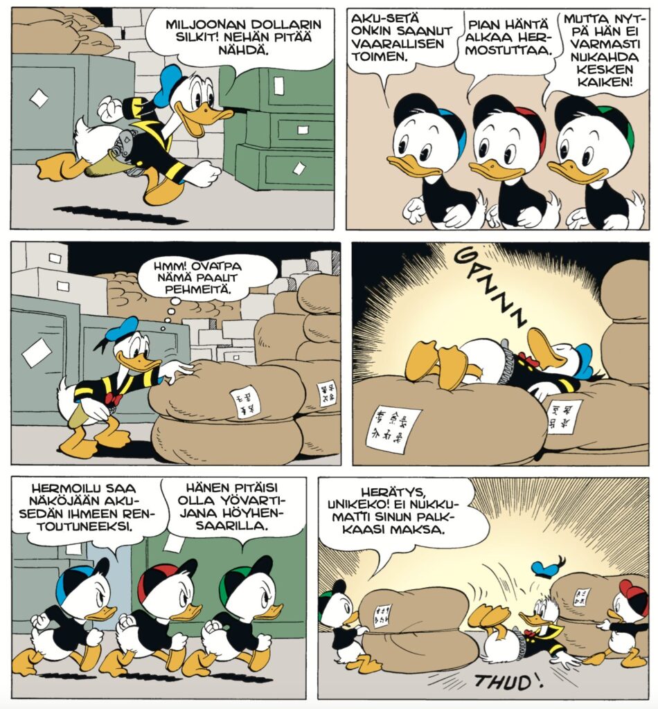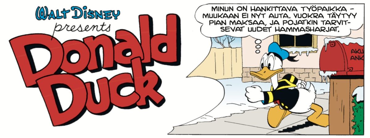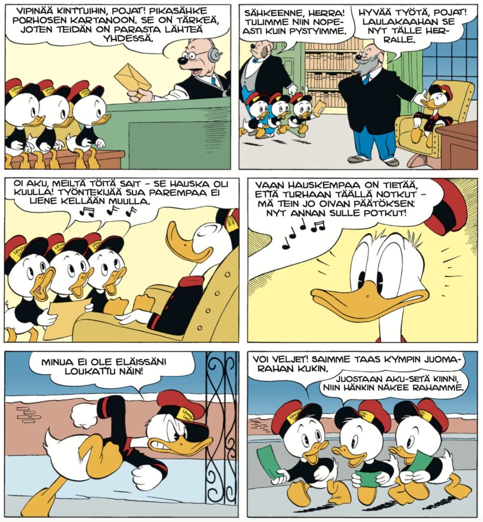 Carl Barks on selkeästi ollut alkuvuodesta 1948 sitä mieltä, että Aku tarvitsee töitä. Ja tottahan se on! Perheellisen miehen on pakko yrittää. Tällä kertaa pojat värväytyvät saman firman hommiin, joten kilpailuasetelma on alusta asti selvä. Yksi Ankkalinnan upeimmista nimivirityksistä esiintyy tämän tarinan sivuilla: Angiina Artriitti! Voitto Porhonen jää kakkoseksi. “Taksi!”