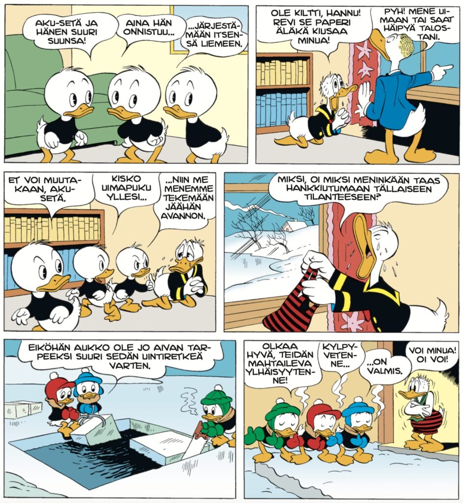 Kun Aku ensin saa vähän loistaa, niin seuraavaksi on suuren suun ja rehvastelun aika kostautua. Hannu Hanhi pääsee pätemään, kun Aku ja pojat uhkaavat menettää talonsa vedonlyönnin seurauksena. Joutuuko Aku avantoon? Joutuu Hannu kulauttamaan katkeran kalkin? Se selviää albumin lukemalla! Akun venkoilu avannon äärellä on fyysisen sarjakuvahuumorin juhlaa.