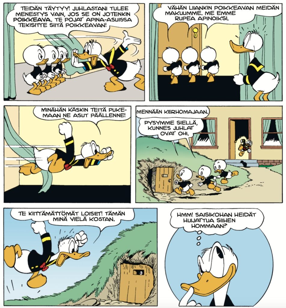 Erään kaverini mielestä todella hauskan jutun mittarina käytetään säkillistä apinoita – eli jos joku juttu on hauskempi kuin säkillinen apinoita, niin laatua siis tarjolla. Ja nyt on ainakin apinointia tarjolla. Aku järjestää puutarhajuhlat viidakkoteemalla. Koska poikien suostuttelu apinoiksi on haastavaa, niin Aku turvautuu vippaskonsteihin. Hypnoosilasien ansiosta Iineskin menee pian apinaksi. Akun juhlien epäonnistumista on ilo seurata. Kun mestari Barks antaa luvan laittaa aivot narikkaan, niin kannattaa kuunnella!