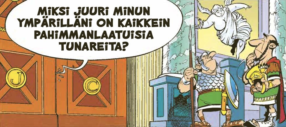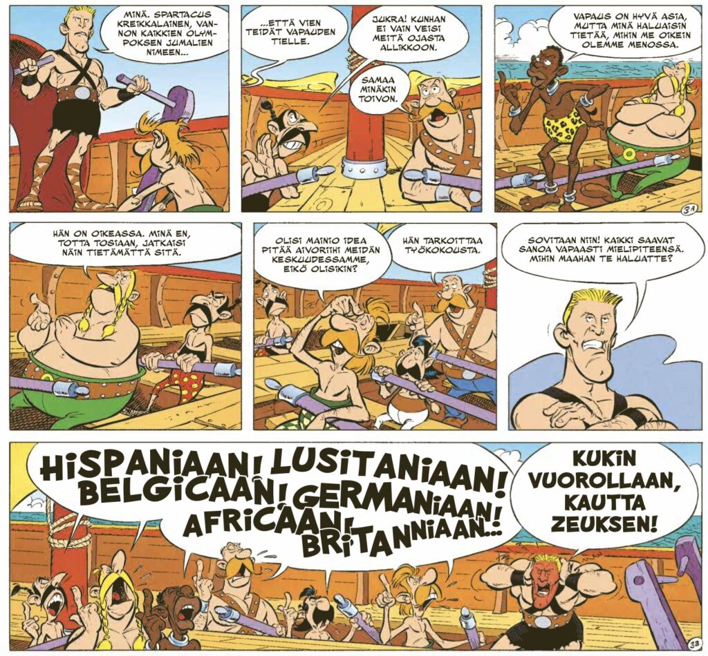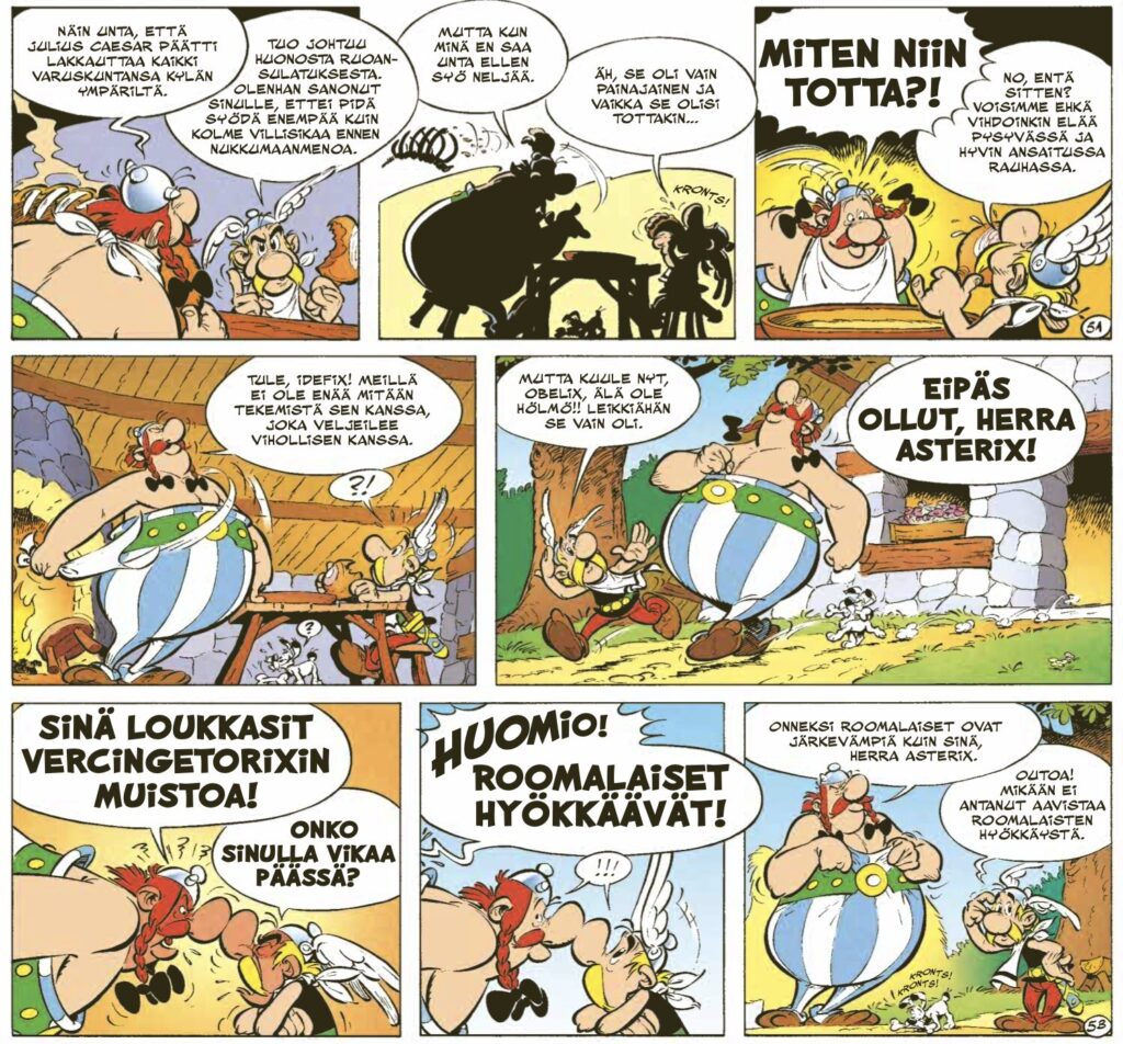 Uderzo osaa piirtää silmiä hivelevää kohellusta ja toisilleen huutavia hahmoja, joten älämölöä piisaa. Sivuhahmojen kohdalla tosin tulee taas Goscinnyä ikävä. Hänen kosketuksensa oli maaginen silläkin saralla. Vakiintunut hahmokatras on niin voimakas, että uudet tulokkaat jäävät turhan helposti seinätapetiksi.
