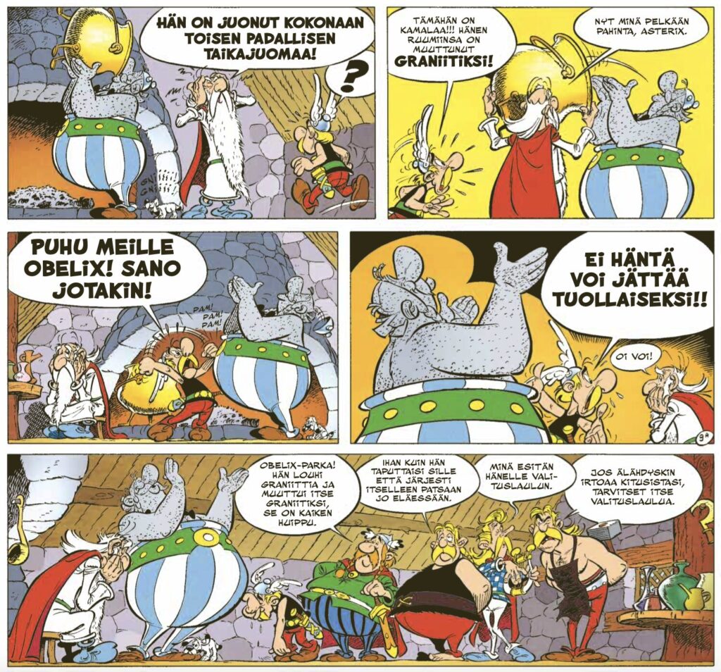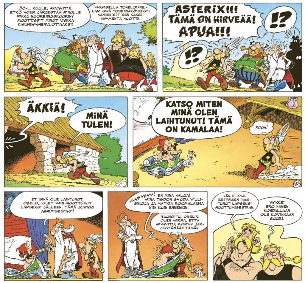 Ensi alkuun Obelix kivettyy. Patsasteleva Obelix on kuitenkin tylsä, joten muutaman kivettymisestä revityn huumorin jälkeen Uderzo antaa Akvavitixin parannuskeinojen tehota sen verran, että Obelixista tulee pikkulapsi. Pikkulapsi ilman taikajuoman antamia supervoimia.