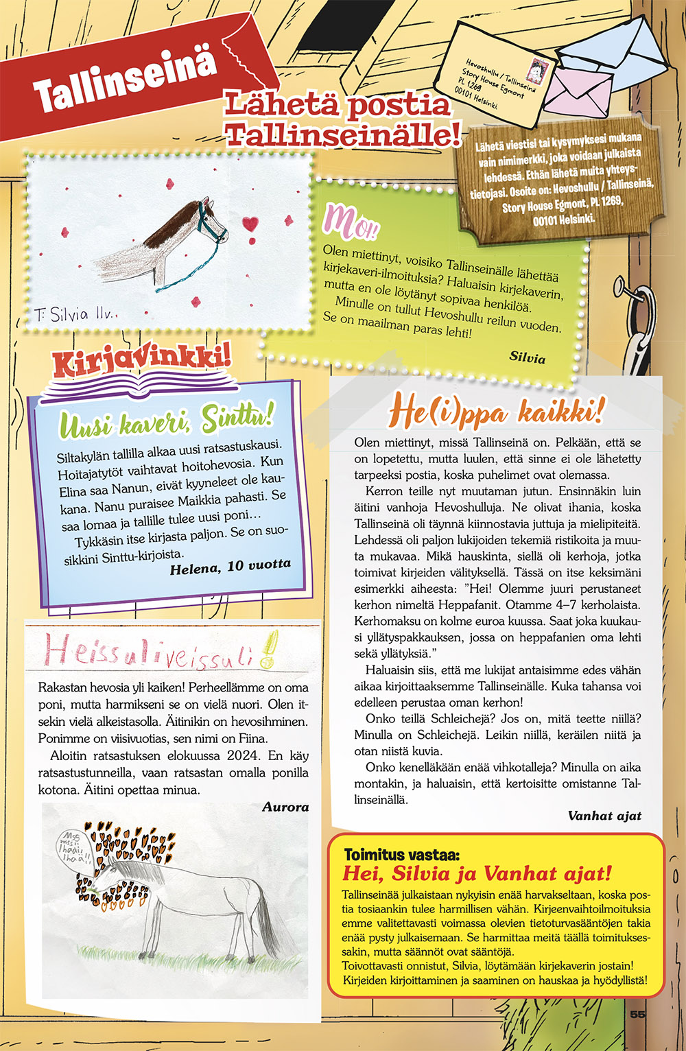 Lukijoilla on mahdollisuus vaikuttaa lehden sisältöön lähettämällä postia, kuten piirustuksia, tarinoita ja mielipiteitä Tallinseinälle, ja tunnustamalla nolot sattumuksensa muille lukijoille Nolot-palstalla. Kysy hevosista -palstalta saa tietoa kaikissa hevosiin liittyvissä asioissa.