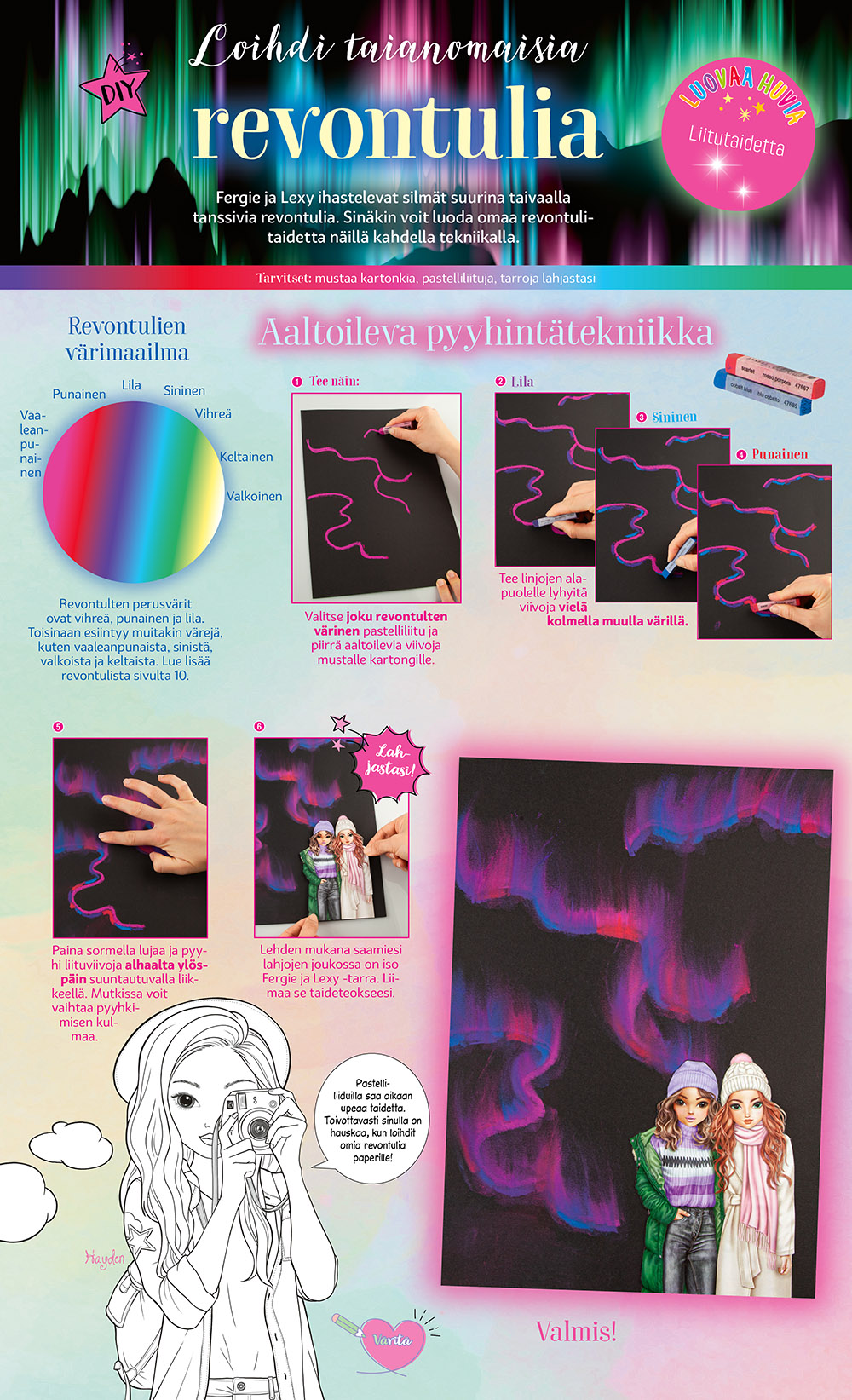 TOPModel -lehti sisältää 44 värikästä sivua, jotka ovat täynnä tekemistä ja lukemista. Lisäksi jokaisen numeron mukana tulee monipuolisia askarteluun sopivia tarroja ja erilaisia pohjia ja malleja sekä piirustus- ja askartelupohjia, joiden avulla voit päästää taiteellisen luovuutesi valloilleen ja harjoitella erilaisia piirustus- ja väritystekniikoita!