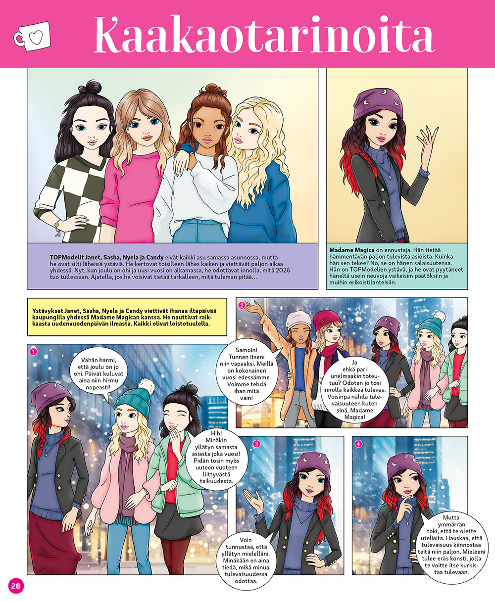 Lehden sivuilla tapaat kaoottisen Lexyn, romanttisen Candyn, taitavan tanssijan Talitan, valokuvaamista harrastavan Mijun, kaheliksi itseään nimittävän Fergien, aurinkoisen Livin, elegantin ja eläinrakkaan Louisen, kaikesta kimaltavasta innostuvan Christyn, itsevarman Janetin, pitkistä aamu-unista nauttivan Nyelan, kunnianhimoisen Haydenin, haaveiluun taipuvaisen Nadjan sekä uusimmat tulokkaat, identtiset kaksostytöt Junen ja Jillin. Menossa ovat mukana niin ikään mallien stylisti Carla Gloss sekä heidän agenttinsa Kay ja supersuositun Us 7 -poikabändin jäsenet Michael, Jay, Justin, Ben, Marc, Milan ja David, joka seurustelee TOPModel Talitan kanssa.